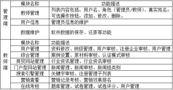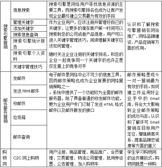1、軟(ruan)件用戶從初(chu)次(ci)訪(fang)問企(qi)業網(wang)(wang)站(zhan)到跟該(gai)企(qi)業訂購產品的整個過程(cheng),可將其分成三個階(jie)(jie)段:網(wang)(wang)站(zhan)建(jian)設階(jie)(jie)段、營(ying)銷(xiao)推廣(guang)階(jie)(jie)段和(he)在(zai)線(xian)業務管(guan)理(li)階(jie)(jie)段。模塊中應(ying)包括:網(wang)(wang)站(zhan)建(jian)設、搜索引擎營(ying)銷(xiao)、郵件推廣(guang)、網(wang)(wang)絡溝通、信息搜索與發布、搜索引擎優化、網(wang)(wang)絡廣(guang)告制作、、客戶服(fu)務、在(zai)線(xian)銷(xiao)售等(deng)(deng)技能的專項實(shi)訓(xun),也能將專項實(shi)訓(xun)匯總(zong),方(fang)便學(xue)生(sheng)開展企(qi)業網(wang)(wang)站(zhan)綜合營(ying)銷(xiao)、作出網(wang)(wang)絡營(ying)銷(xiao)效果評估等(deng)(deng)的集中實(shi)訓(xun)。