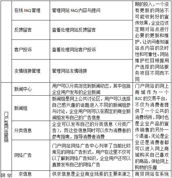 (2)企業網(wang)站管理(li)與營銷:模塊什么時候需(xu)要維(wei)護?新聞(wen)管理(li)有(you)何用處?如(ru)何管理(li)網(wang)站會(hui)員(yuan)?FAQ對網(wang)站有(you)什么幫助?是(shi)否(fou)留(liu)意反(fan)饋信息?是(shi)否(fou)解(jie)決(jue)顧(gu)客投(tou)訴?是(shi)否(fou)需(xu)要友(you)情(qing)鏈(lian)接?