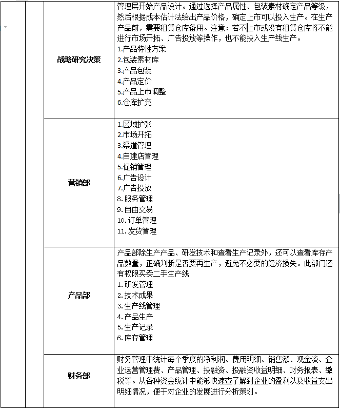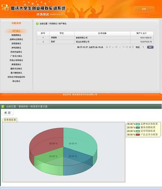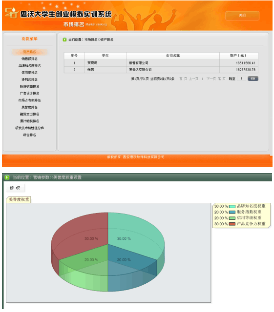5、系統具有(you)自動(dong)計(ji)分和手(shou)動(dong)評分功能。自動(dong)計(ji)分以各方面排(pai)(pai)(pai)名的(de)形式,包括資(zi)金(jin)排(pai)(pai)(pai)名、銷售排(pai)(pai)(pai)名、知名度排(pai)(pai)(pai)名、利(li)潤排(pai)(pai)(pai)名、投資(zi)收益排(pai)(pai)(pai)名、廣(guang)告設計(ji)排(pai)(pai)(pai)名、市場占有(you)率排(pai)(pai)(pai)名、美譽(yu)度排(pai)(pai)(pai)名、投融資(zi)收益排(pai)(pai)(pai)名、累計(ji)繳(jiao)稅排(pai)(pai)(pai)名、綜合(he)排(pai)(pai)(pai)名等。教(jiao)師可以批閱學生所提交的(de)計(ji)劃書、廣(guang)告設計(ji)、市場調查分析、公司(si)制(zhi)度等。