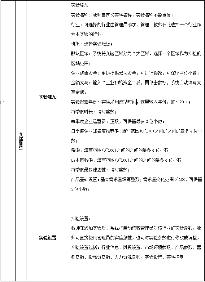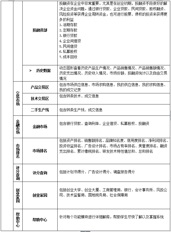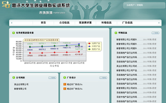思沃大(da)(da)學(xue)(xue)(xue)生(sheng)創(chuang)(chuang)(chuang)(chuang)(chuang)(chuang)業(ye)(ye)模擬(ni)(ni)實(shi)訓平臺系統(tong)(tong)(tong)從大(da)(da)學(xue)(xue)(xue)生(sheng)創(chuang)(chuang)(chuang)(chuang)(chuang)(chuang)業(ye)(ye)的(de)(de)現狀分析,將創(chuang)(chuang)(chuang)(chuang)(chuang)(chuang)業(ye)(ye)教(jiao)育的(de)(de)內(nei)容以(yi)及因素(su)滲透在(zai)(zai)專業(ye)(ye)實(shi)踐(jian)教(jiao)學(xue)(xue)(xue)中(zhong),并(bing)根(gen)據創(chuang)(chuang)(chuang)(chuang)(chuang)(chuang)業(ye)(ye)教(jiao)育的(de)(de)目(mu)標及內(nei)容設置較(jiao)完善的(de)(de)創(chuang)(chuang)(chuang)(chuang)(chuang)(chuang)業(ye)(ye)實(shi)踐(jian)體系。軟件模擬(ni)(ni)交(jiao)互思想,采(cai)用國際先進的(de)(de)計(ji)算機仿真技術(shu),仿真模擬(ni)(ni)虛擬(ni)(ni)市場環境、市場調查以(yi)及整個市場競(jing)爭(zheng)結(jie)構。學(xue)(xue)(xue)生(sheng)通過(guo)軟件學(xue)(xue)(xue)習創(chuang)(chuang)(chuang)(chuang)(chuang)(chuang)業(ye)(ye)心理(li)學(xue)(xue)(xue)、創(chuang)(chuang)(chuang)(chuang)(chuang)(chuang)業(ye)(ye)講堂、網上創(chuang)(chuang)(chuang)(chuang)(chuang)(chuang)業(ye)(ye)、創(chuang)(chuang)(chuang)(chuang)(chuang)(chuang)業(ye)(ye)準備(bei)等創(chuang)(chuang)(chuang)(chuang)(chuang)(chuang)業(ye)(ye)知識(shi)(shi),撰寫一(yi)份(fen)創(chuang)(chuang)(chuang)(chuang)(chuang)(chuang)業(ye)(ye)計(ji)劃書(shu),投入到(dao)創(chuang)(chuang)(chuang)(chuang)(chuang)(chuang)業(ye)(ye)實(shi)戰(zhan)中(zhong)。創(chuang)(chuang)(chuang)(chuang)(chuang)(chuang)業(ye)(ye)實(shi)戰(zhan)分為公司(si)注冊和實(shi)戰(zhan)運(yun)營。公司(si)注冊采(cai)用Flash動畫(hua)模式,模擬(ni)(ni)公司(si)注冊的(de)(de)整個流程。實(shi)戰(zhan)運(yun)營是整個系統(tong)(tong)(tong)的(de)(de)主(zhu)體,將全(quan)國分為七(qi)個區(qu)域:東北地(di)區(qu)、華北地(di)區(qu)、西(xi)北地(di)區(qu)、華東地(di)區(qu)、西(xi)南(nan)地(di)區(qu)、華中(zhong)地(di)區(qu)、華南(nan)地(di)區(qu)。系統(tong)(tong)(tong)模擬(ni)(ni)公司(si)內(nei)部與外(wai)在(zai)(zai)市場之間(jian)的(de)(de)矛盾,創(chuang)(chuang)(chuang)(chuang)(chuang)(chuang)業(ye)(ye)者通過(guo)各種調查、決(jue)策解決(jue)企業(ye)(ye)市場運(yun)營過(guo)程中(zhong)可能遇到(dao)的(de)(de)各種情況(kuang)。在(zai)(zai)區(qu)域需求飽和后擴大(da)(da)市場,對其中(zhong)出(chu)現的(de)(de)問題和運(yun)營結(jie)果進行分析與評(ping)估(gu),培養大(da)(da)學(xue)(xue)(xue)生(sheng)正確的(de)(de)人生(sheng)觀、價(jia)值(zhi)觀、就業(ye)(ye)觀,提(ti)高大(da)(da)學(xue)(xue)(xue)生(sheng)勇于(yu)創(chuang)(chuang)(chuang)(chuang)(chuang)(chuang)業(ye)(ye)的(de)(de)精神,讓(rang)大(da)(da)學(xue)(xue)(xue)生(sheng)有良好(hao)的(de)(de)創(chuang)(chuang)(chuang)(chuang)(chuang)(chuang)業(ye)(ye)意識(shi)(shi),增強(qiang)大(da)(da)學(xue)(xue)(xue)生(sheng)自主(zhu)創(chuang)(chuang)(chuang)(chuang)(chuang)(chuang)業(ye)(ye)能力。